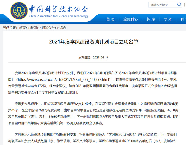 近日,中国科协公布了2021年度学风建设资助计划项目立项名单。我院《“研本共建”成材共同体》项目经过自主申报、专家评议等层层选拔,被中国科协认定为2021年“学风传承示范基地”之一。