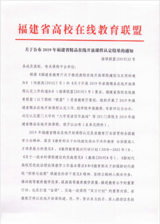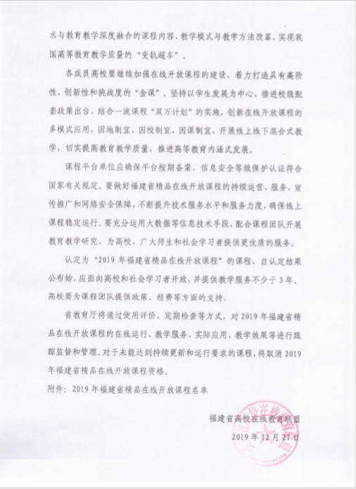 福建省精品在线开放课程认定是省教育厅全面贯彻全国教育大会精神,推动高等教育教学改革,提高高等教育教学质量,推进教育公平的重要行动,也是打造“金课”和实施一流课程“双万计划”的重要内容。此次认定全省共293门课程入选,我校共29门课程入选。
