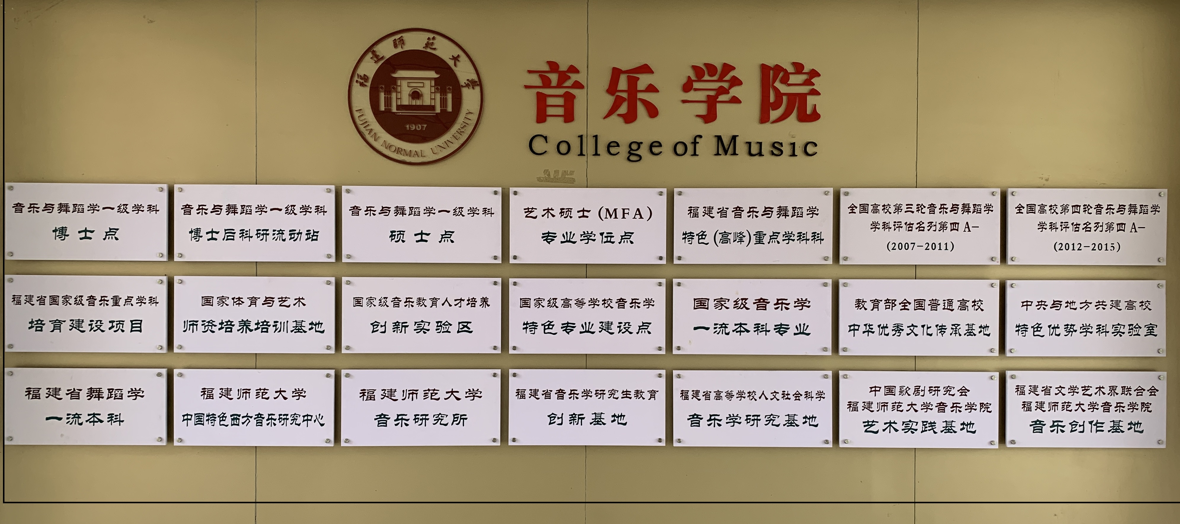 音乐学、舞蹈学两个专业均为国家级一流本科专业建设点。学院还拥有国家级音乐教育人才培养创新实验区、国家级高等学校音乐学特色专业建设点、教育部全国普通高校中华优秀传统文化传承基地、中央与地方共建高校特色优势学科实验室,以及福建省音乐与舞蹈学高峰重点学科。这些平台共同构成了学院教学、科研、艺术实践的高水平支撑体系。