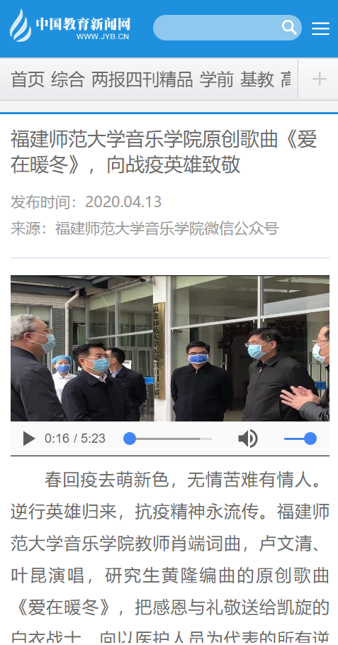 近日,在学院领导的统筹推动下,由我院教师肖端词曲,卢文清、叶昆演唱,研究生黄隆编曲的原创歌曲《爱在暖冬》相继在国家级、省级媒体《光明日报》、中国教育新闻网、“学习强国”福建平台、中国侨联活动公众号、福建师范大学官微,福师大小葵公众号等平台展播,受到社会各界和广大师生一致好评。