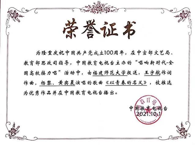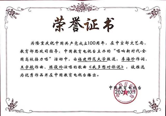 为隆重庆祝中国共产党成立一百周年,在中宣部文艺局、教育部思政司指导,中国教育电视台主办的唱响新时代·全国高校接力唱活动中,我院两首原创歌曲《我多想对你说》《以青春的名义》被推选为优秀作品,并在中国教育电视台播出。
