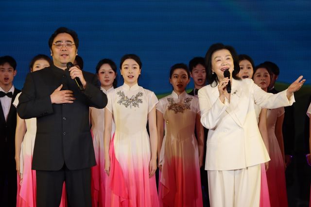 现场,马秋华院长以极具感染力的艺术风范和深厚的声乐造诣,与孙砾教授默契携手,共同担纲领唱,深刻诠释了歌曲中蕴含的对祖国山河的无限热爱与深情眷恋。在他们动人歌声的引领下,我院合唱团与舞蹈团的同学们以饱满的精神状态、专业的艺术水准,呈现了一场声情并茂、舞乐交融的精彩演出,引发了全场强烈的情感共鸣。演出结束后,省政协党组书记、主席滕佳材,省政协党组副书记、副主席黄海昆、副主席阮诗玮与马秋华院长亲切交流,并对我院师生的表现给予了高度赞誉。