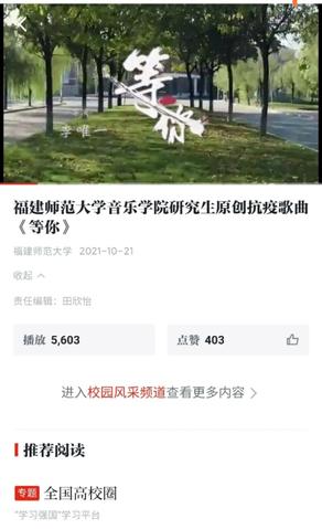 近日,音乐学院和传播学院合作,由学院研究生陈涵婧作曲,王雨薇指挥,温艺璇钢琴伴奏,传播学院学生融媒体中心参与制作的原创抗疫歌曲《等你》倾情上线,并在学习强国平台展播。