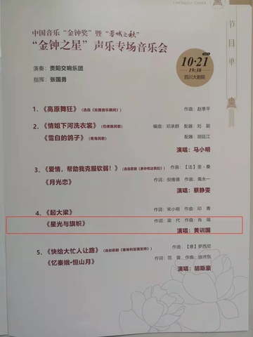 10月21日,中国著名指挥家、中国音乐家协会副主席张国勇教授执棒贵阳交响乐团,联袂历届中国音乐金钟奖声乐获奖者,为观众带来“金钟之星”声乐专场音乐会。由2013年金钟奖声乐(民族)金奖获得者、国家一级演员、青年男高音黄训国倾情演唱肖端老师的原创歌曲《星光与旗帜》。