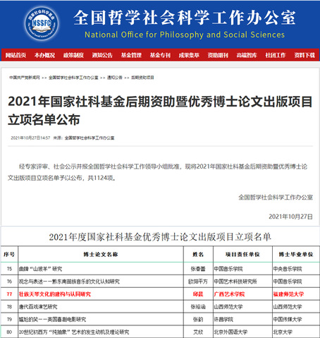 10月27日,全国哲学社会科学工作办公室公布了2021年国家社科基金后期资助暨优秀博士论文出版项目立项名单。国家社科基金共资助80个优秀博士论文出版项目,我院2016级音乐与舞蹈学专业邱晨的博士学位论文《壮族天琴文化的建构与认同研究》获得资助。该学位论文获评2020年福建省优秀博士学位论文,指导教师为音乐学院陈新凤教授。