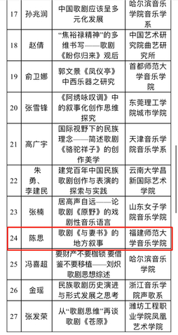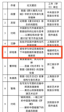 近日,由中国音乐评论学会、山东艺术学院发布的“人音社杯”第二届歌剧评论推优活动入选名单公布,我院邱桂香老师的《感性学与辩证思维视域下中国歌剧形象塑造思维新探》和2020级硕士研究生陈思的《歌剧〈与妻书〉的地方叙事》入选。