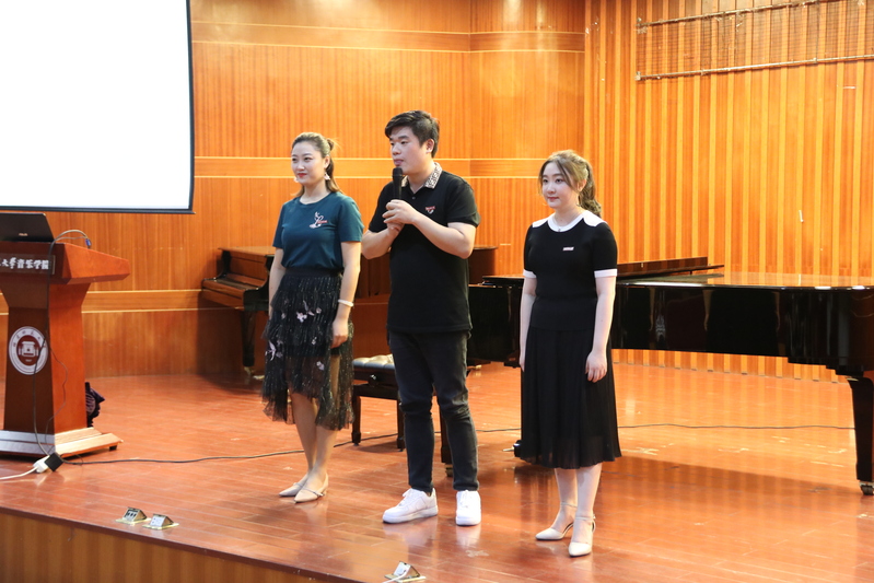 本次线下课程主要采取音乐会的形式,面对在校学生(特别是非音乐专业学生)开展普及性的音乐(声乐)教育。线下课程由王宇航老师主持,讲解歌唱技巧和解析声乐作品,并担任大部分作品的声乐伴奏。张方,王楚两位老师示范演唱,林昕老师协助伴奏工作。整堂课内容丰富,深入浅出。艺术歌曲《在水一方》优美动听,令人沉醉。《父亲的草原母亲的河》和《龙船调》充满民族乡土气息,极具感染力。流行歌曲《一荤一素》深情的演绎勾起了人们的思绪,触碰听众心底的柔软,余韵绵绵。《海恋》高亢激昂,百听不厌,描绘出大海的波澜壮阔。接下来,歌剧选段男女声二重唱《紫藤花》和音乐剧选段《我不再》,委婉动人,拨人心弦。《故乡的云》通过对家乡自然美景的赞颂道出了千万游子归乡的渴望。《玛依拉变奏曲》运用变奏曲式的手法,体现了哈萨克人民积极乐观的生活态度。授者娓娓道来,听者津津有味,台上台下精彩互动,掌声不断。