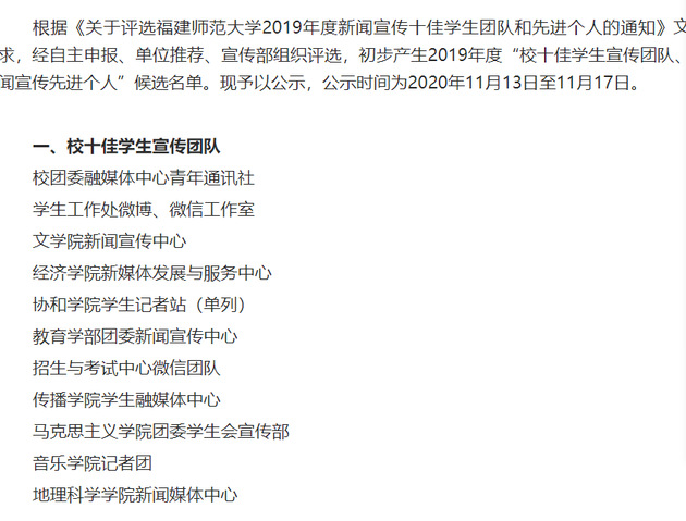 近日,据《关于评选福建师范大学2019年度新闻宣传十佳团队和先进个人的通知》,经自主申报、单位推荐、校宣传部组织评选,我院学生记者团荣获“校十佳学生宣传团队”称号,张诺男、卢星池两位同学获“校新闻宣传先进个人”称号。本次评选既肯定了在院团委指导下记者团过去一年的工作成果,也为新一年工作的开展打下良好基础。