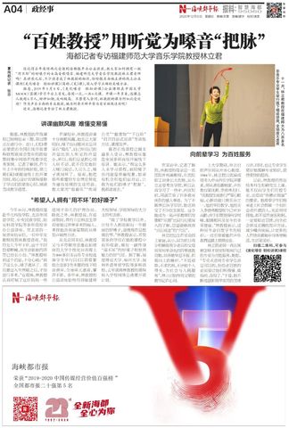 近日,《海峡都市报》以《“百姓教授”用听觉为嗓音“把脉”》为题,对我院林立君教授进行专访。长期以来,林立君教授始终致力于将学校课堂与社会大课堂相结合,本着为百姓服务、为社会作贡献的理念教导和培养学生。近年来,作为福建省三八红旗手的林立君教授参加了近百场公益演出、讲座等活动。今年10月,林教授应邀赴华北科技学院、北京外国语学院、中央民族学院、防灾科技学院等多所高校举办公益讲座。不仅如此,林教授还主持了爱课程教师教学能力提升MOOC项目《美化嗓音-轻松讲课》公益课程,自2019年5月8日在中国大学MOOC学习平台上首发后,仅一年多的时间,选课总人数超6万人,好评如潮,广受赞誉。