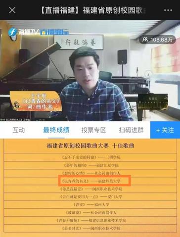“以音乐之名点亮青春梦想,用原创之声唱响时代新声”2020年福建省原创校园歌曲大赛决赛12月13日上午在福建省广播影视集团举行。比赛采用云竞赛方式,专家评审与主创代表们线上交流互动,“隔空”对话,结合网友的人气推荐及专业、严谨的评审,最终我院青年教师王宇航创作作品《以青春的名义》荣获福建省原创校园歌曲大赛十佳歌曲。